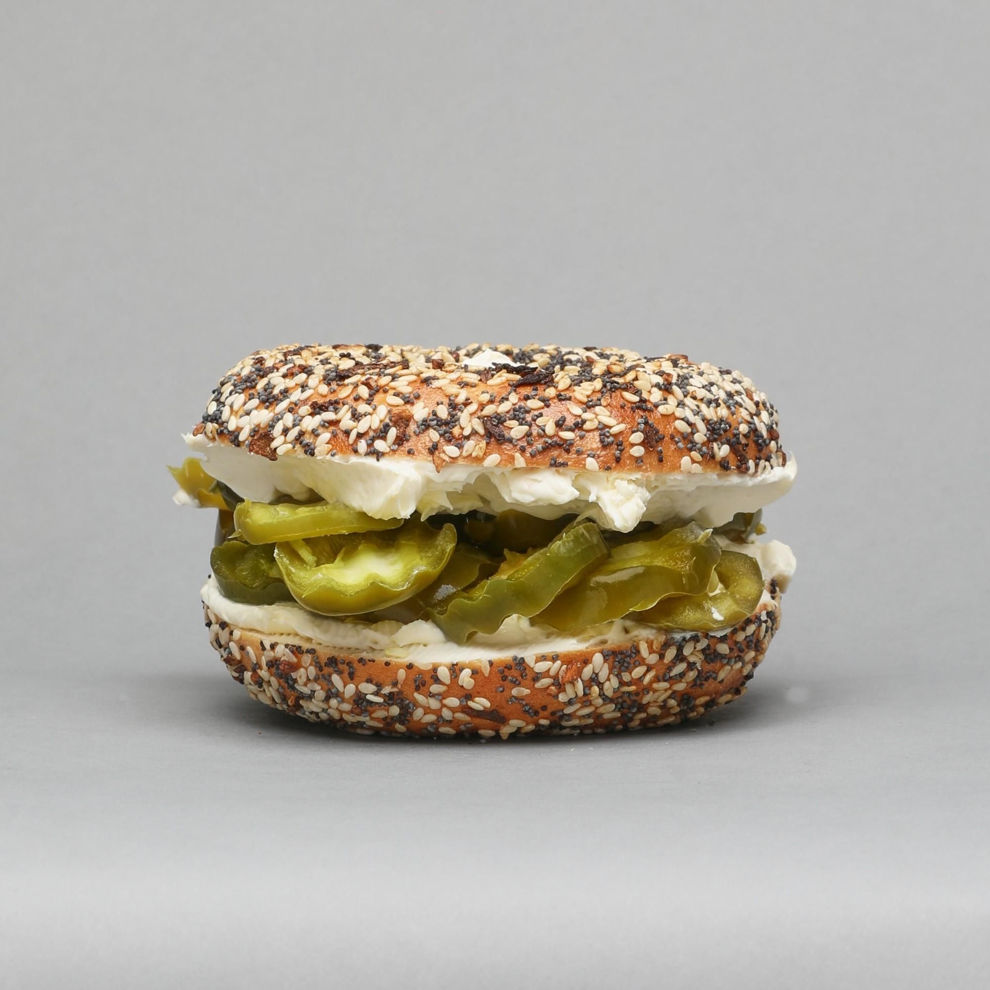 A generous serve of cream cheese topped with pickled jalapeños.