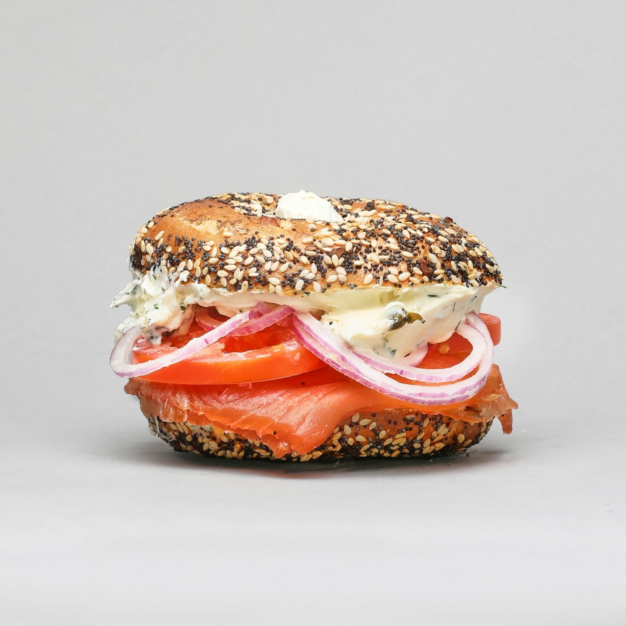 With dill & caper cream cheese, tomato & red onion.